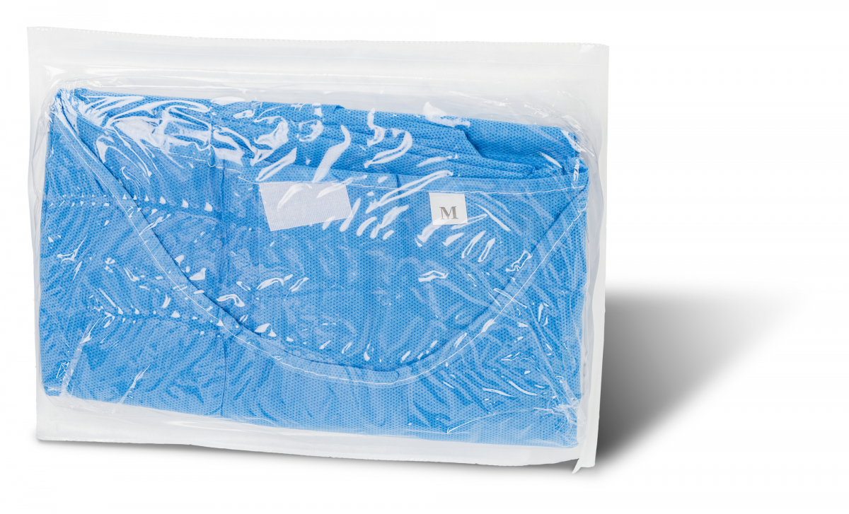 CAMICE IN SMS - Camice chirurgico avvolgente con polsino e chiusura con velcro , in tre strati di monofilamento di polipropilene SMS 50 g/m². Caratteristiche principali: antiriflesso e coprente, estremamente resistente a strappi e lacerazioni, ottima barriera alla trasmigrazione batterica e ottima resistenza alla penetrazione di liquidi o sangue (emoidrorepellenza), buona traspirabilità, antistatico, ottima vestibilità e massimo comfort anche durante interventi da seduti, nessuna combustione a contatto con raggi laser o fonti di energia (ex. elettrobisturi), termodistruzione senza rilasci di residui o vapori tossici. Confezione: 10 pezzi - Colore Azzurro