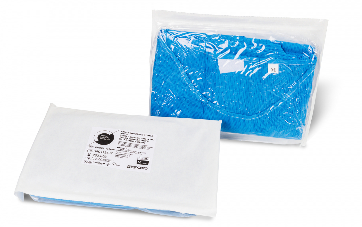 e chiusura con velcro in tre strati di monofilamento di polipropilene SMS 50 g/m². Caratteristiche principali: antiriflesso e coprente, estremamente resistente a strappi e lacerazioni, ottima barriera alla trasmigrazione batterica e ottima resistenza alla penetrazione di liquidi o sangue (emoidrorepellenza), buona traspirabilità, antistatico, ottima vestibilità e massimo comfort anche durante interventi da seduti, nessuna combustione a contatto con raggi laser o fonti di energia (ex. elettrobisturi), termodistruzione senza rilasci di residui o vapori tossici. Destinazione d'uso: per lo staff chirurgico in sala operatoria o per procedure ambulatoriali d'urgenza. DISPOSITIVO MEDICO DI CLASSE I, conforme alle direttive UE (93/42/CEE). VERSIONE STERILE. Confezione: 10 pezzi - Colore Azzurro