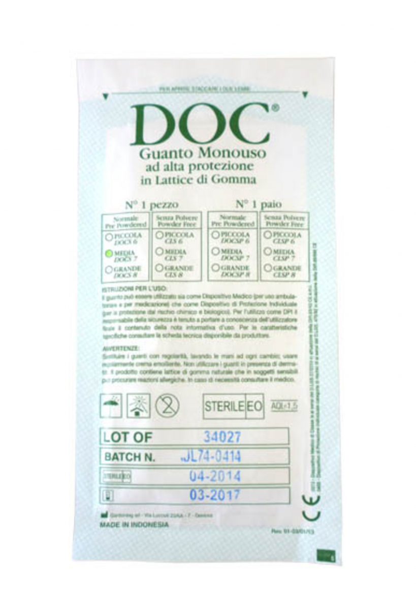 GUANTI DOC CHIRURGICI Guanto chirurgico sterile, in puro lattice di gomma naturale, con polvere, a bassissimo contenuto di proteina del lattice. La superficie microruvida garantisce una presa ottimale in ogni condizione di utilizzo. Conforme alle norme della Farmacopea Internazionale (USP). AQL (Acceptable Quality Level) <1,5.