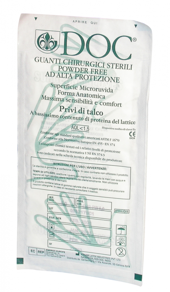 GUANTI DOC CHIRURGICI POWDER FREE Guanto chirurgico sterile, in puro lattice di gomma naturale, senza polvere, a bassissimo contenuto di proteina del lattice. La superficie microruvida garantisce una presa ottimale in ogni condizione di utilizzo. Conforme alle norme della Farmacopea Internazionale (USP). AQL (Acceptable Quality Level) <1,5. Confezione: 1 paio