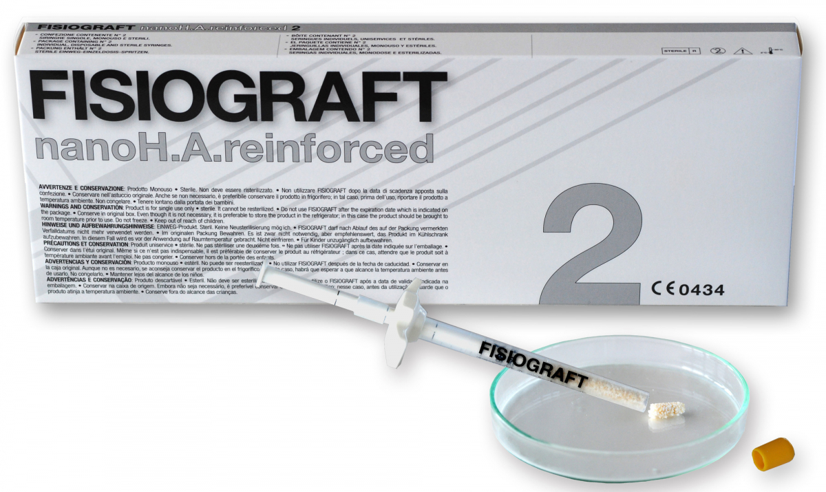 FISIOGRAFT NANO H.A. REINFORCED Materiale composito biocompatibile a base di nanoidrossiapatite e destrano e di una miscela di copolimeri polilattici e poliglicolici. Indicato per riempimenti ossei parodontali, implantari, post-estrattivi e per lesioni ossee dopo interventi di chirurgia odontoiatrica e maxillo-facciale. La sua peculiarità consiste nel lasciarsi permeare dal sangue proveniente dall'osso, diventando così, grazie alla presenza di idrossiapatite nanometrica, nucleo di ossificazione del nuovo tessuto osseo nel sito di applicazione. Le confezioni sono monouso e sterilizzate a raggi gamma. Confezione: 2 siringhe da 1 ml cad.