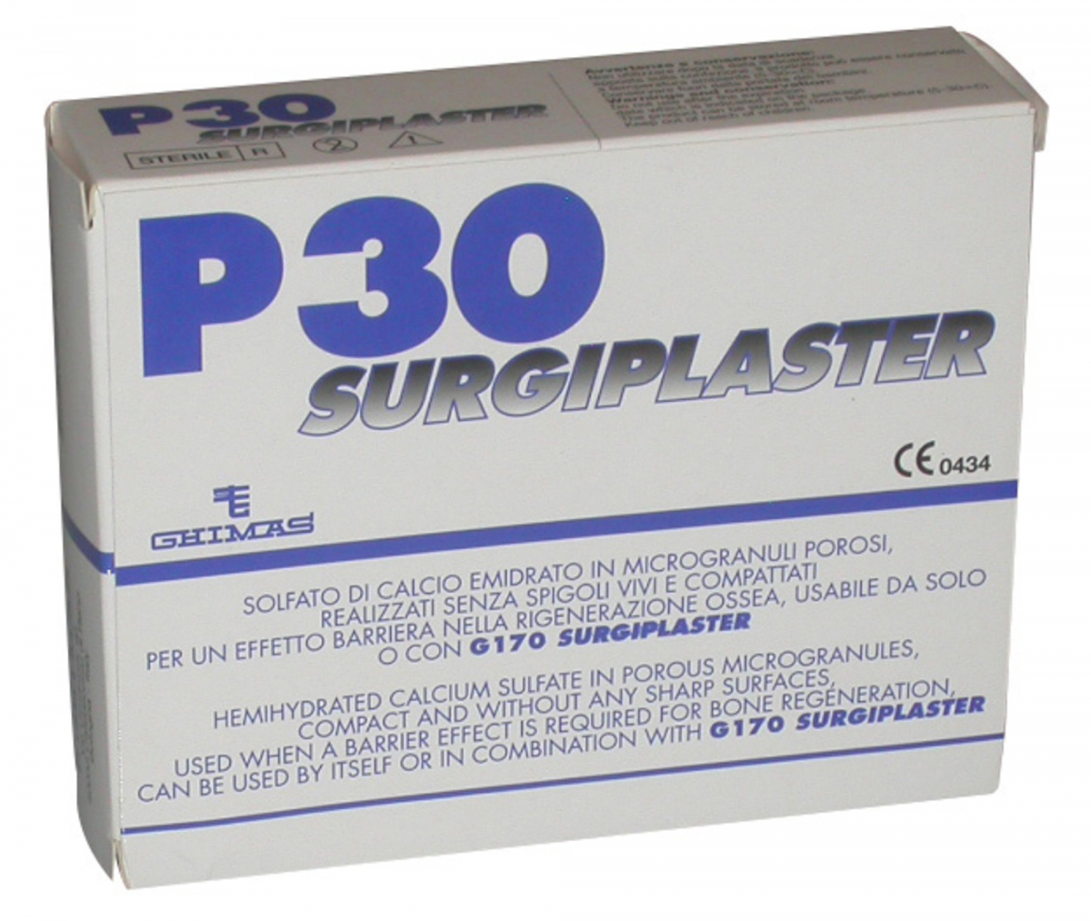 SURGIPLASTER Biomateriale per rigenerazione ossea a base di solfato di calcio; osteoconduttore, batteriostatico, totalmente riassorbibile. Può essere utilizzato puro, miscelato con osso autologo o con biomateriale da riempimento alternativo. P 30 Microgranuli (250 µm): ideale per un effetto barriera, utilizzabile da solo o con G 170. Confezione: 1 flacone da 2 gr di Solfato di calcio emidrato + 1 fialetta da 400 mg di Solfato di calcio emidrato polvere + 1 fialetta da 1 ml liquido Regular + 1 fialetta da 1 ml liquido Fast + accessori