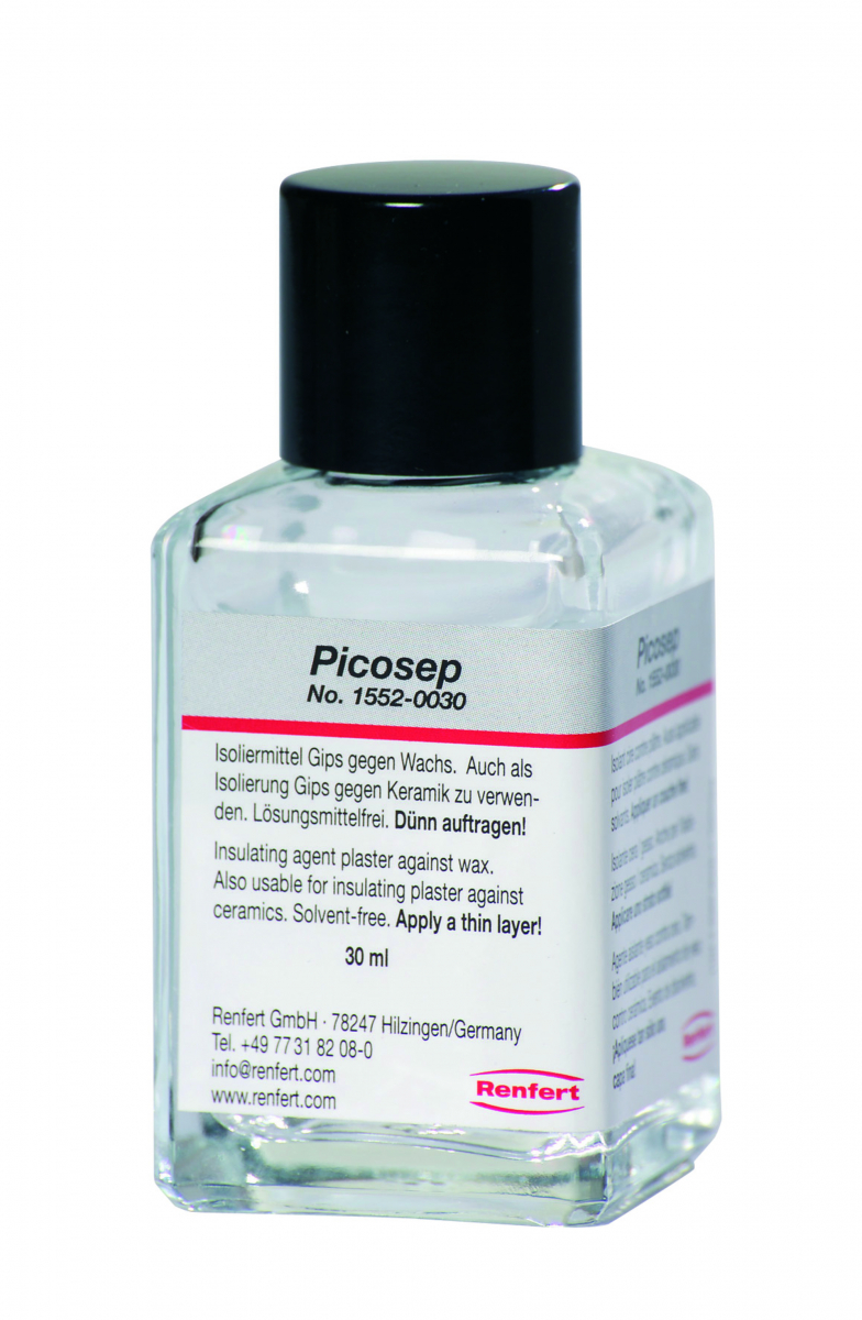 PICOSEP Isolante gesso/cera liquido a base di silicone, particolarmente indicato per la tecnica di immersione del moncone nella cera. Privo di solventi, non intacca la vernici per monconi e le cere e non evapora. L'effetto tensioattivo su gesso, resina e metallo facilita l'applicazione della cera. Flacone da 30 ml.