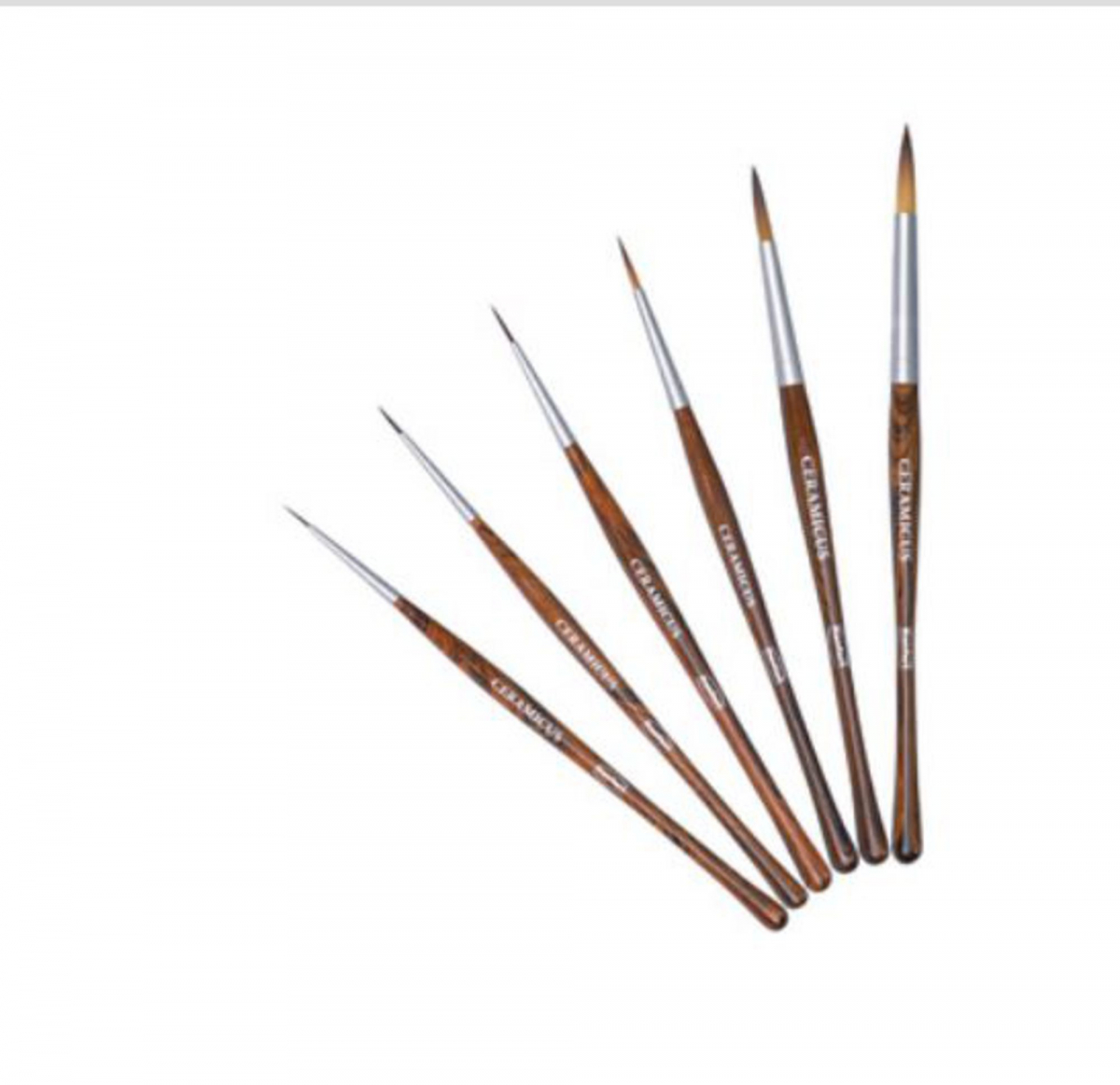 PENNELLI PER CERAMICA CERAMICUS - Renfer t Pennelli dalle innovative setole in micr ofibra e manico in radica, caratterizzat i da eccezionali caratteristiche di rite nzione e rilascio dei liquidi: per tanto non devono essere continuamente bagnati nel bicchiere d'acqua per ripristinare o pulire l'estremità, la quale si pulisc e e si riforma in un attimo. La punta prende facilmente la forma di u na spatola a bordo largo e diritto che m antiene la sua stabilità; ciò permette d i trasportare una gran quantità di ceram ica e di stratificare nelle zone interde ntali senza utilizzare lo strumento meta llico. Set: 6 pennelli Regular (misura 1/0-1-2- 4-6-8)