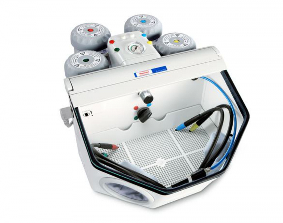 BASIC QUATTRO IS - Renfert Sabbiatrice affidabile, con sistema IS ( Immediate Stop) di arresto immediato int egrato che regola l'inizio e la fine del processo di sabbiatura in pochi secondi e garantisce la sabbiatura controllata e mirata di manufatti filigrani. L'apparecchio di alta gamma, consente di eseguire qualsiasi operazione di sabbia tura (con fino a 4 serbatoi): regolazion e esatta e monitoraggio della pressione per ogni singolo serbatoio. Innovativo concetto di perfetta visibili tà (PerfectView): Tecnologia LED unica n el suo genere, contrasto ottimale su ogn i oggetto ed elevata luminosità all'inte rno della camera di sabbiatura. Luce diurna con 4800 Lux per lavorare se nza affaticare la vista; massimo campo v isivo per un massimo controllo e lastra visiva ricoperta ai siliconi con una dur ata 10 volte superiore per una chiara vi sibilità. La spaziosa camera di sabbiatu ra offre una grande libertà di movimento : i comandi operativi situati all'intern o riducono la durata dei processi lavora tivi