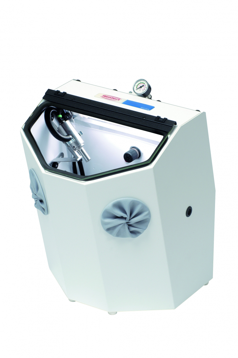 VARIO BASIC Sabbiatrice universale e multifunzionale , ideale per laboratori medi e piccoli, che combina le caratteristiche di una sabbiatrice a riciclo con quelle di una microsabbiatrice. Possibilità di ampliamento modulare fino a quattro serbatoi per la microsabbiatura; predisposta per il collegamento ad un apparecchio pneumatico supplementare. Indicazione della pressione tramite manometro esterno. I dispositivi di comando si trovano all'interno dell'ampia cabina di sabbiatura; grande maneggevolezza con l'interruttore a pedale azionabile a 360°. Consumo di abrasivo ridotto del 50% grazie ad un sistema di aspirazione intelligente. Dimensioni esterne: 380x540x450 mm (LxHxP). Peso: 14 Kg. Volume cabina di sabbiatura: 23 Lt. Capienza serbatoio: 1000 ml.Pressione di esercizio: 1-6 bar. Dotazione: apparecchio base senza serbatoi