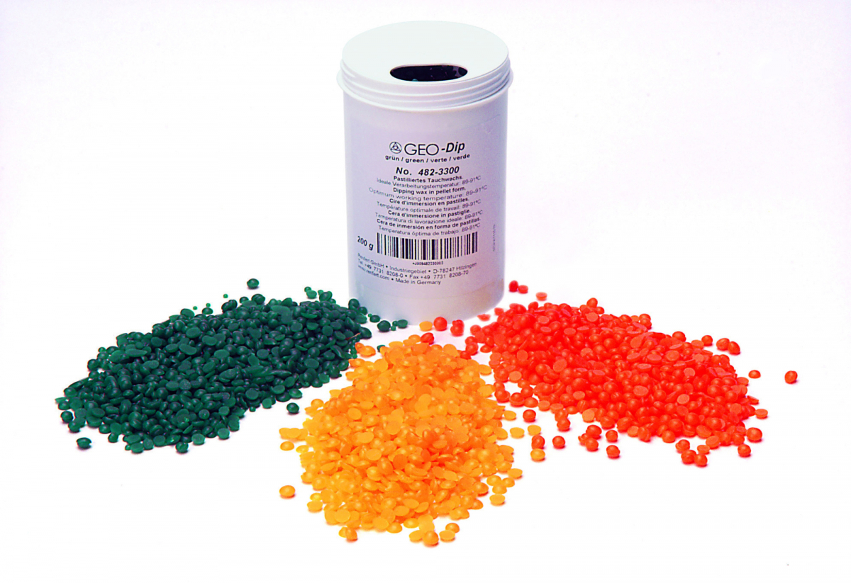 CERA DIP GEO Cera speciale da immersione in pellets, per la lavorazione nei fusori per cera elettrici. Massima precisione, minima contrazione, ottima viscosità (89-91°C): ne risultano cappette riproducibili ed esatte (con pareti di spessore uniforme), stabili e formabili reversilmente, facili da tagliare sul limite della preparazione. I colori chiari giallo e arancione sono particolarmente adatti a controllare lo spessore della cappetta; con il colore verde scuro è possibile controllare permanentemente lo spessore della modellazione quando si usano delle cere di colore chiaro. Confezione da 200 gr. COLORE GIALLO
