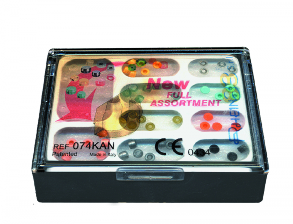 KIT ASSORTIMENTO COMPLETO CAPPETTE RITENTIVE KIT NORMO, CONFEZIONE CONTENENTE: 8 cappette rosa - ritenzione soft; 8 cappette trasparenti - ritenzione standard; 6 cappette gialle - ritenzione extra soft; 6 cappette verdi trasparenti ritenzione molto elastica; 6 cappetta oro - super resiliente; 6 cappetta argento - super resiliente; 4 cappette verde acqua - ritenzione standard foro interno stretto; 4 cappette arancio - ritenzione molto elastica foro interno stretto; 4 cappette nere - uso laboratorio; 2 cappette titan cap; 2 cappette bianche - teflon.