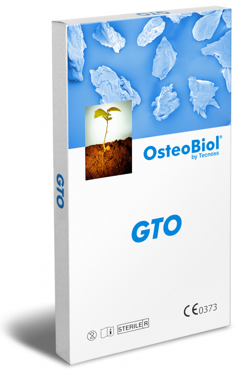 OsteoBiol® GTO ® è un sostituto osseo di origine suina. E’ un mix di granuli collagenati cortico-spongiosi con granulometria 600-1000 µm, opportunamente miscelati con OsteoBiol® TSV Gel, che è a sua volta una miscela di gel collagene eterologo tipo I e III con acidi grassi poli-insaturi diluito in una soluzione acquosa contenente un copolimero sintetico biocompatibile.