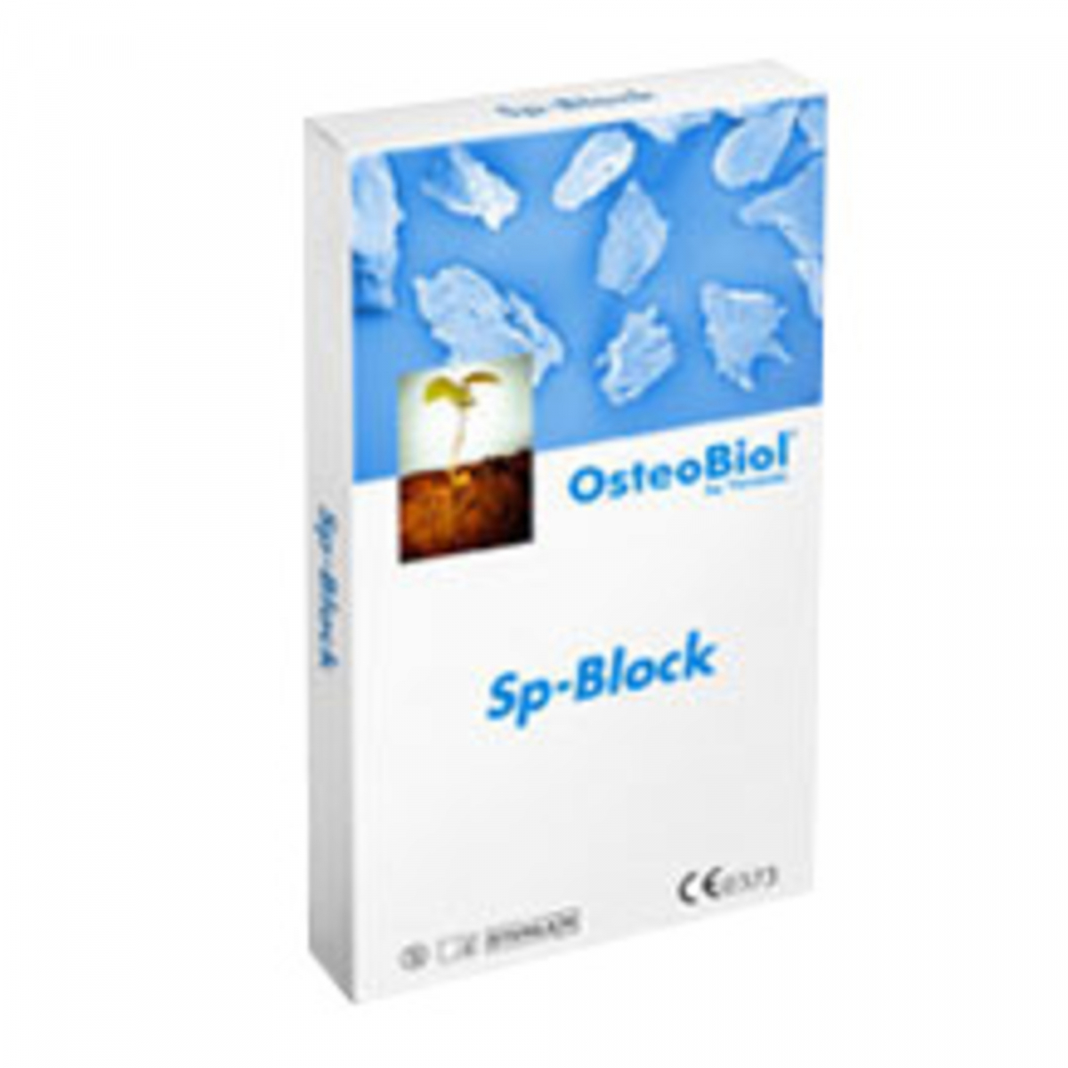 OSTEOBIOL SP-BLOCK Blocco costituito da osso spongioso collagenato di origine eterologa. Perfettamente biocompatibile e gradualmente riassorbibile, svolge azione di supporto alla neoformazione ossea, mantenendo costante la forma ed il volume dell'innesto. Il suo contenuto di collagene facilita il coagulo ematico e la successiva invasione di cellule rigenerative e riparative, favorendo la "restitutio ad integrum" dell'osso mancante. Indicazioni cliniche: aumenti ossei verticali mediante tecnica inlay e orizzontali (difetti a due pareti). Tempi medi di rientro: 8 mesi ca. Confezione: 1 blocco essiccato - Misura 35x10x5 mm
