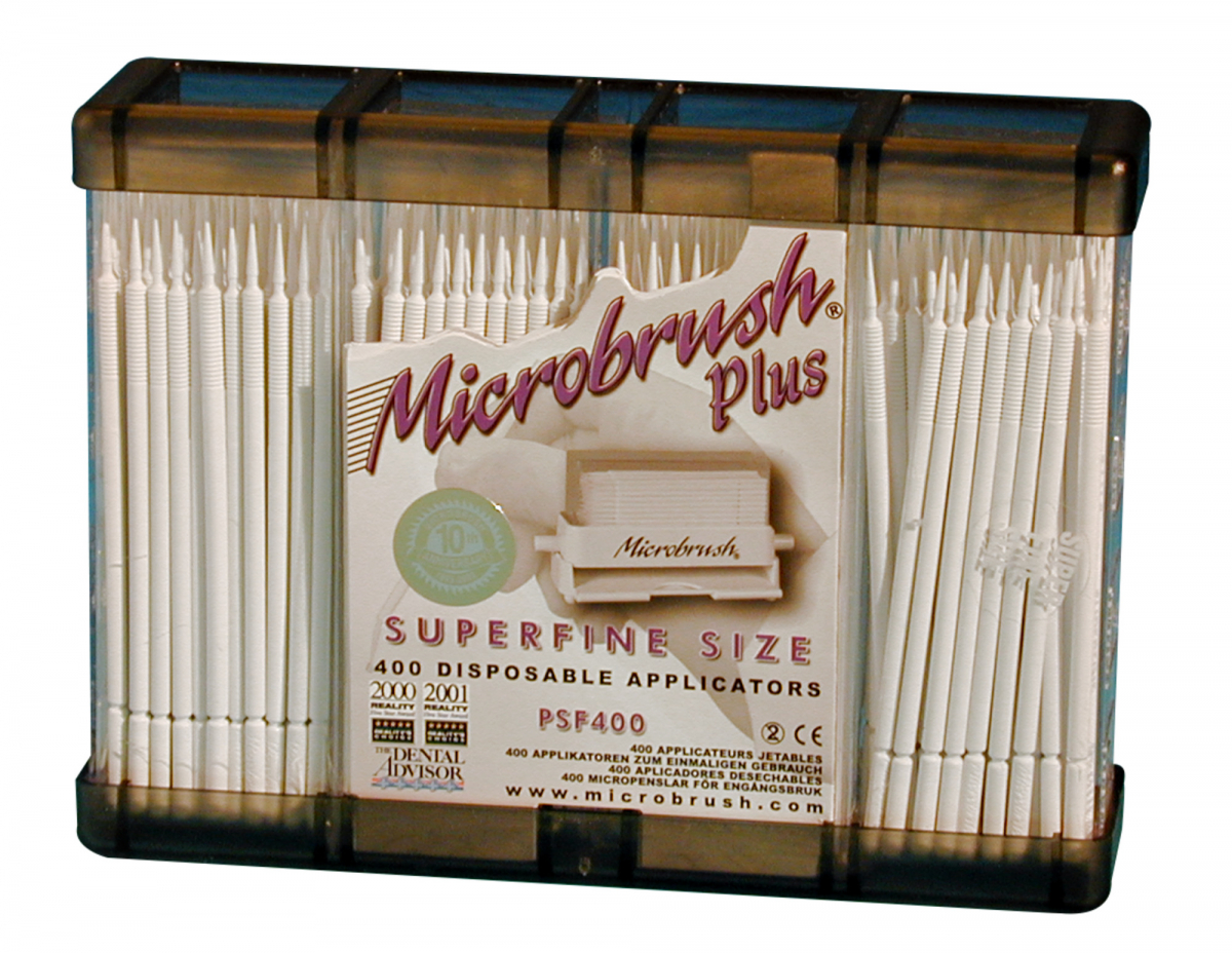 MICROBRUSH PLUS Applicatori per composito, monouso. Provvisti di terminale con microfibre, orientabile, ed impugnatura di plastica con lunghezza riducibile. TERMINALE REGULAR (impugnatura disponibile nei colori azzurro, grigio, verde e viola). Confezione: 400 pezzi, in 4 dispenser da 100 pezzi cad.