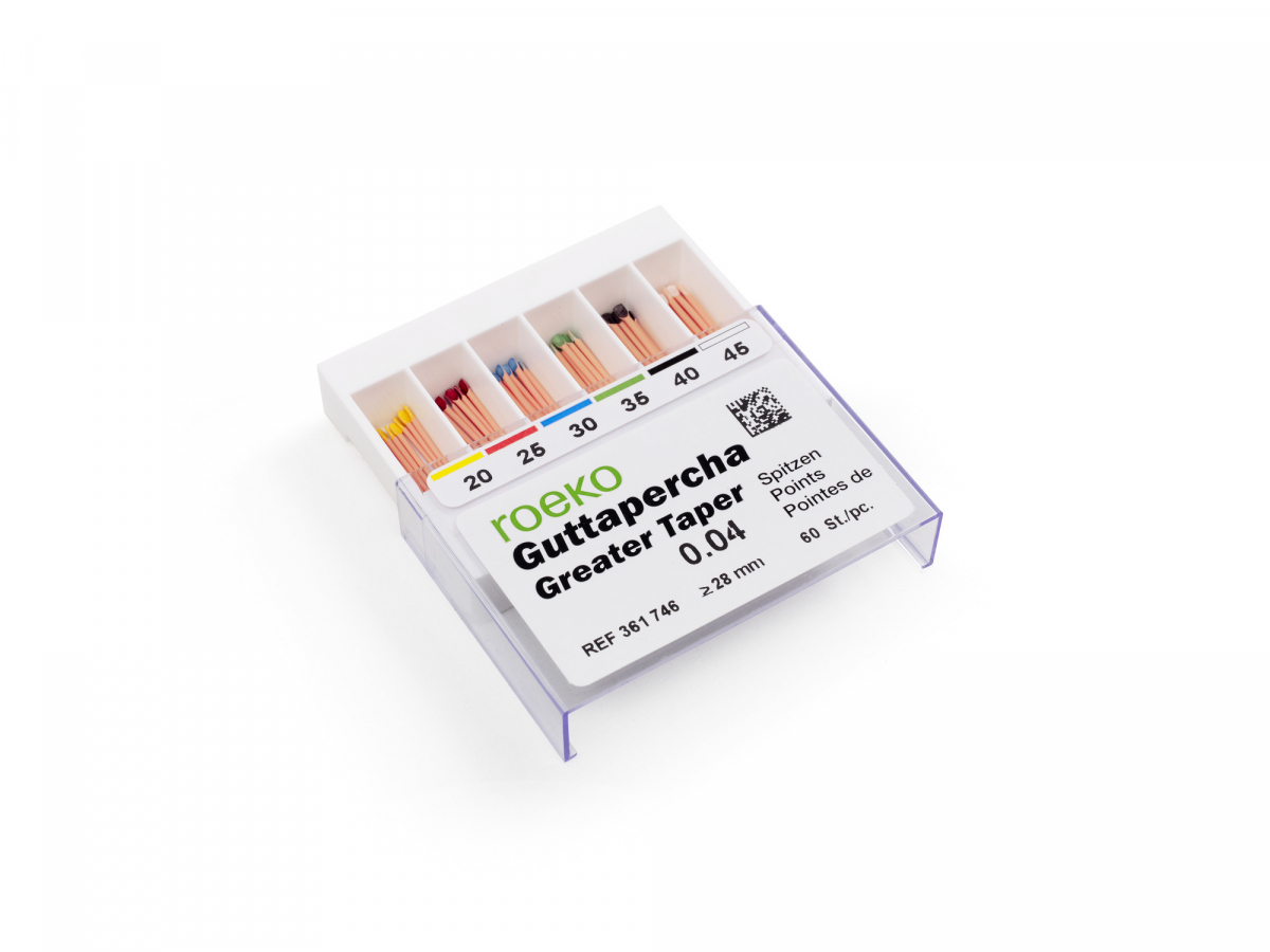 GREATER TAPER Punte di guttaperca standardizzate ISO, a conicità aumentata, per l'otturazione dei canali radicolari. Il loro utilizzo è particolarmente indicato con strumenti in Nichel-Titanio. Lunghezza 28 mm - Conicità 4%. Confezione: 60 pezzi