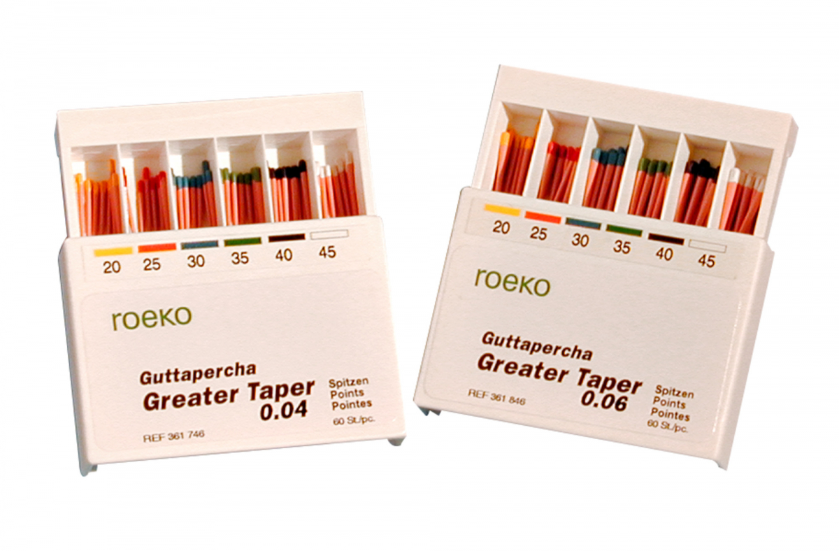 GREATER TAPER Punte di guttaperca standardizzate ISO, a conicità aumentata, per l'otturazione dei canali radicolari. Il loro utilizzo è particolarmente indicato con strumenti in Nichel-Titanio. Lunghezza 28 mm - Conicità 6%. Confezione: 60 pezzi