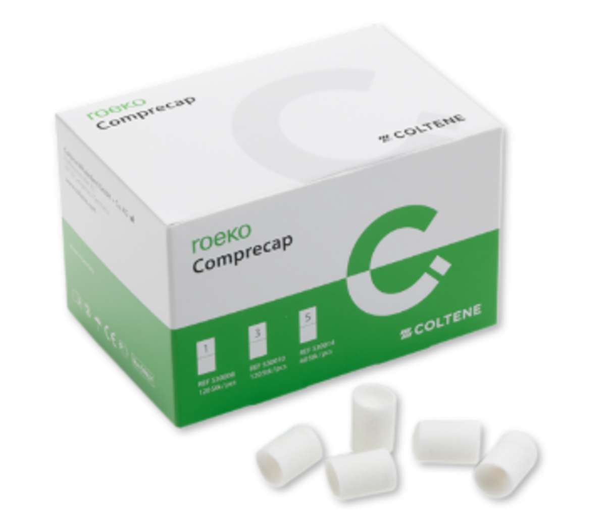 COMPRECAP - Roeko Calottine di cotone per la preparazione dell'impronta. Le sottili pareti lateral i e l'incavo più profondo dei Comprecap, consentono di creare un solco ben apert o, garantendo confini della preparazione netti e riconoscibili. Comprecap, compr imendo il moncone asciutto, ferma il san guinamento in modo naturale e spinge più profondamente il filo di retrazione nel solco: si ottiene così un solco più lar go. Confezione ricambio da 60 pezzi Misura 5 Ø 14 MM