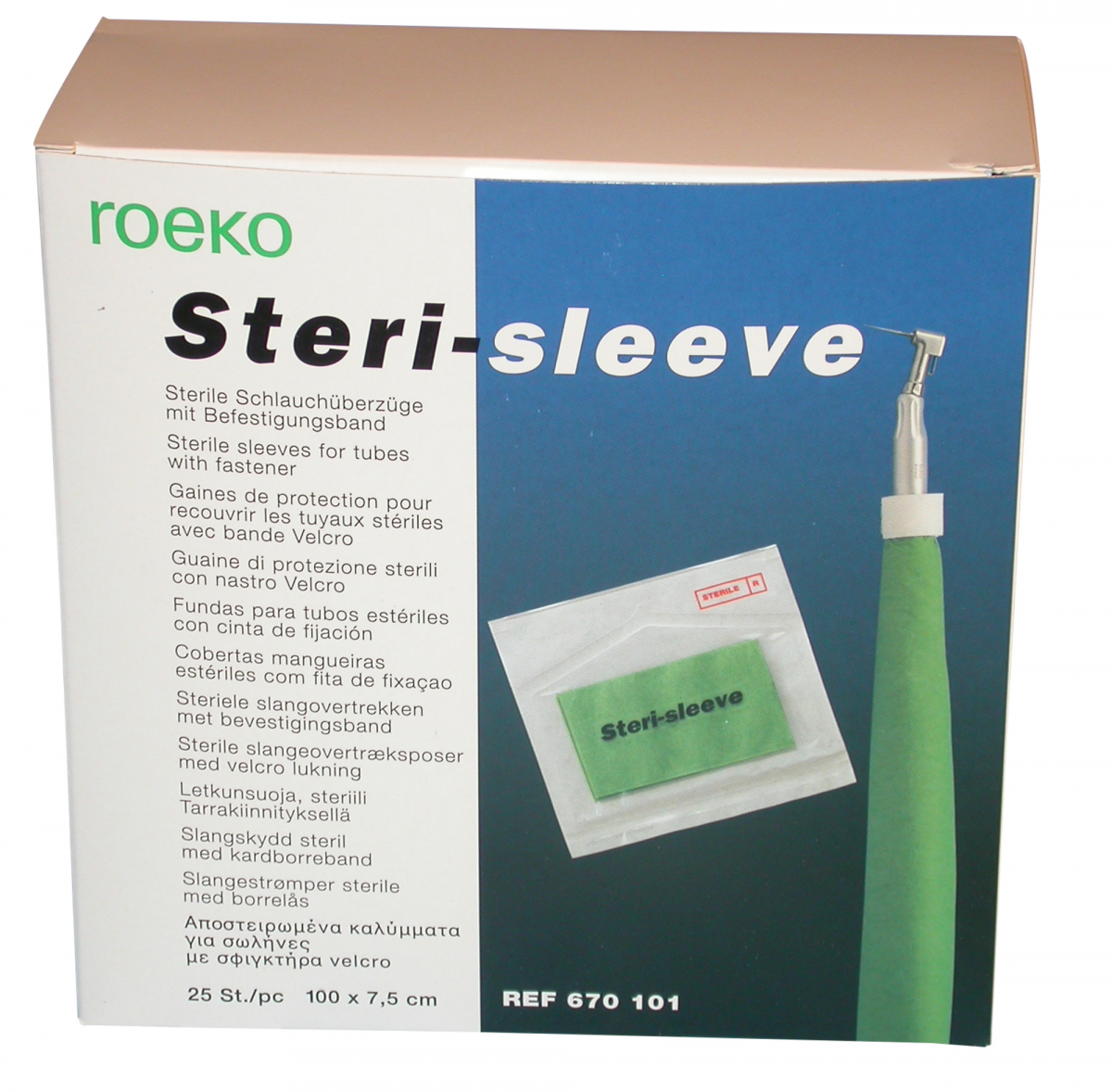GUAINE DI PROTEZIONE Guaine monouso in plastica, rivestite all'esterno con carta assorbente, indicate per tubi di aspirazione e fruste per trapani. Le guaine possono essere fissate ai tubi con una fascia velcro o con una fascia adesiva. GUAINE STERILI / STERI-SLEEVE (misura cm 7,5x1 m). Confezione: 25 guaine complete di fascia adesiva.