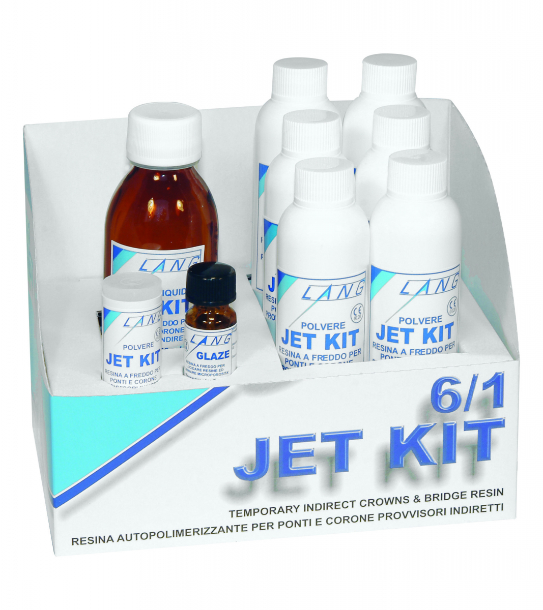 JET KIT Resina acrilica per provvisori indiretti, autopolimerizzante a freddo, in colorazione Vita. Cofanetto 6/1: 6 polveri da 30 gr cad. nei colori 35/45/62/65/67/81 + liquido da 120 ml +