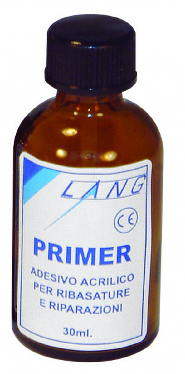 PRIMER Adesivo monocomponente, per ribasature e riparazioni, ideale per saldare nuovi e vecchi materiali (polimerizzati sia a caldo che a freddo), o prima di ogni riparazione o aggiunte su manufatti acrilici (protesi, provvisori, ecc). Pronto all'uso si stende facilmente con un pennello sulle superfici. Confezione Ricambio: 1 flacone da 30 ml
