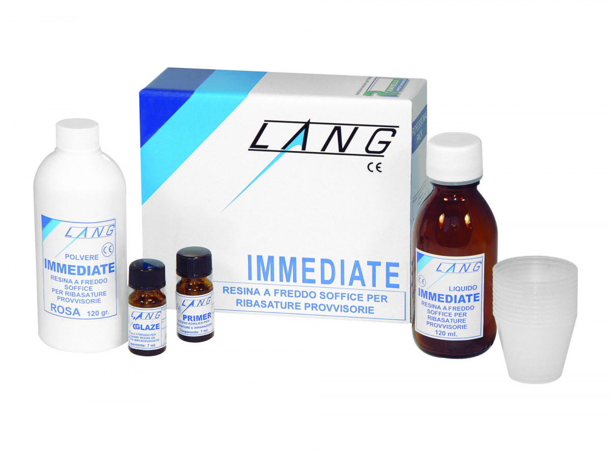 IMMEDIATE Ribasatore semiprovvisorio extrasoft, con nuova formulazione priva di ftalati, caratterizzato da sistema PDA (Progressive Dual Action) di doppia fase elastica ad indurimento progressivo. Nella prima fase la consistenza extrasoft, per il trattamento post- estrattivo con protesi immediate, permane per un periodo prolungato. Successivamente inizia la fase "Progressive Hard", di indurimento parziale, che favorisce un lento adattamento del paziente alla base rigida, in vista della protesi definitiva. Indicato per protesi provvisorie su impianti osteointegrati e per estensioni e modificazioni dei bordi della protesi. Professional Kit: polvere da 120 gr + liquido da 120 ml + Primer + Glaze