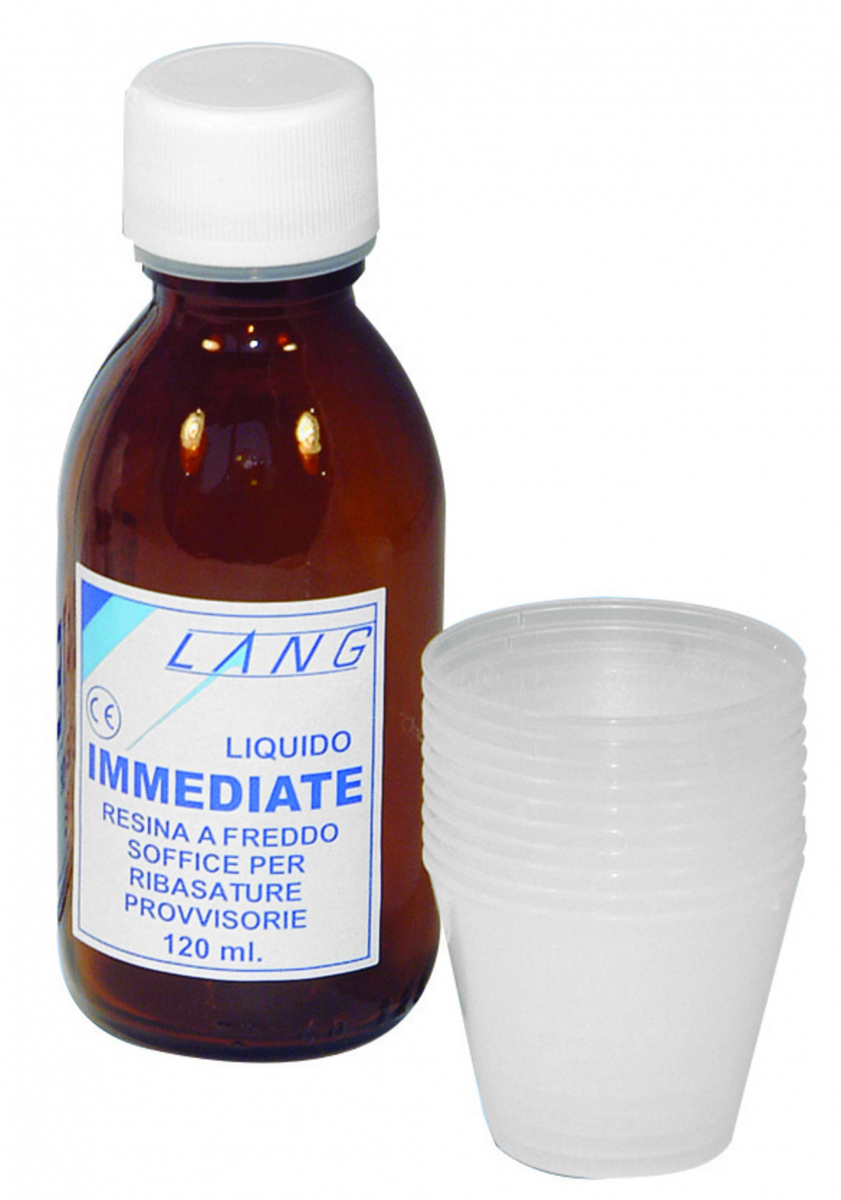 IMMEDIATE Ribasatore semiprovvisorio extrasoft, con nuova formulazione priva di ftalati, caratterizzato da sistema PDA (Progressive Dual Action) di doppia fase elastica ad indurimento progressivo. Nella prima fase la consistenza extrasoft, per il trattamento post- estrattivo con protesi immediate, permane per un periodo prolungato. Successivamente inizia la fase "Progressive Hard", di indurimento parziale, che favorisce un lento adattamento del paziente alla base rigida, in vista della protesi definitiva. Indicato per protesi provvisorie su impianti osteointegrati e per estensioni e modificazioni dei bordi della protesi. Ricambio di liquido da 120 ml