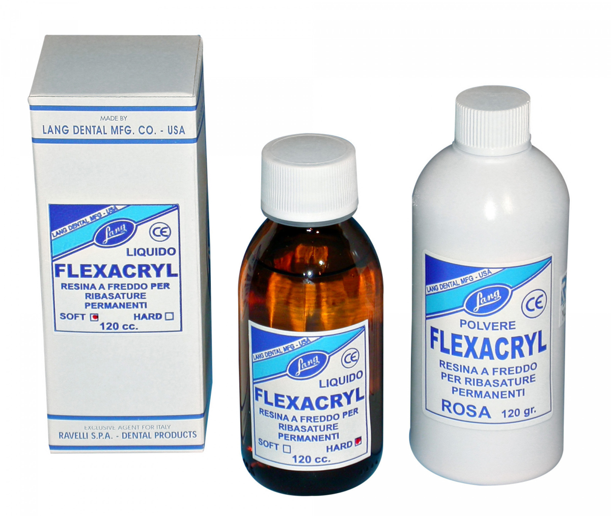 FLEXACRYL HARD Resina acrilica per ribasature dirette e indirette, autopolimerizzante a freddo. Versione Hard, per adeguare vecchie protesi o per stabilizzare protesi di pazienti già portatori. Polvere da 120 gr - Colore Pink