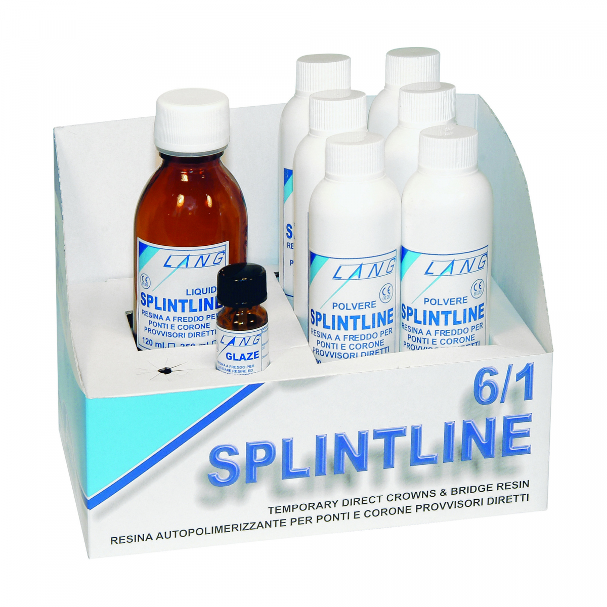 SPLINTLINE Resina acrilica per provvisori, autopolimerizzante a freddo, indicata per tecnica diretta. Cofanetto 6/1: 6 polveri da 30 gr cad. (colori A1,A2,A3,A3.5,B3,D3) + 1 flacone di liquido da 120 ml