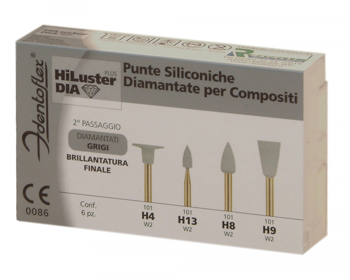 IDENTOFLEX HILUSTER PLUS DIA Sistema diamantato per la rifinitura e lucidatura dei compositi. Caratterizzato da perfetto adattamento al restauro (grazie alla flessibilità della matrice siliconica) e da elevata resistenza all'usura: notevole capacità di taglio del diamante che consente di ottenere risultati ottimali già a basse velocità. Hiluster Plus Dia grazie ai cristalli di diamante micronizzati dispersi nella matrice siliconica garantisce un'eccezionale brillantatura finale. PUNTE IN GOMMA IDENTOFLEX PLUS DIA: colore grigio/tipo H. Confezione: 6 pezzi