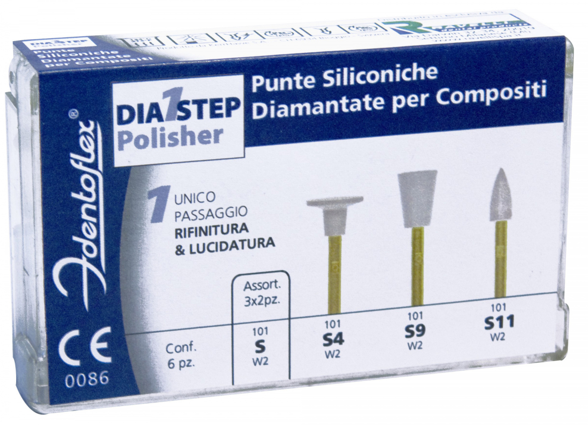 DIA 1STEP Sistema per la lucidatura dei compositi in un solo passaggio. Grazie al rivoluzionario legante siliconico altamente flessibile, si adatta perfettamente al restauro senza pregiudicarne la forma e le caratterizzazioni e, variando pressione operativa e numero di giri, può essere utilizzato anche a secco favorendo una maggiore visibilità del restauro senza surriscaldare la matrice resinosa. Confezione: 6 pezzi