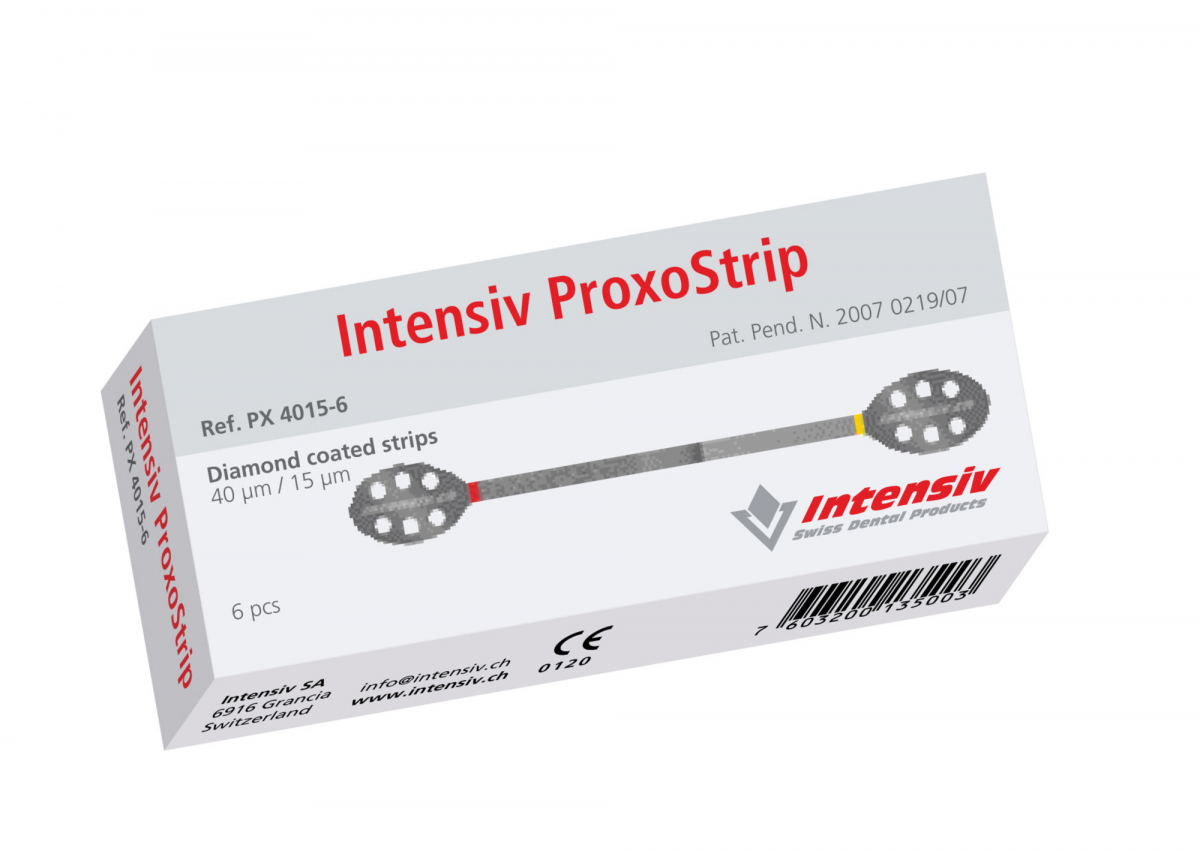 PROXOSTRIP Strisce abrasive metalliche con due lati diamantati in differenti granulometrie (40 µm/rosso, 15 µm/giallo), estremità ampie e forate per una presa sicura ed ergonomica. L'altezza di 2,5 mm e la parte centrale non diamantata garantiscono il rispetto assoluto del punto di contatto. Indicate per la rifinitura e la lucidatura dei restauri nelle zone interprossimali. Confezione: 6 strisce