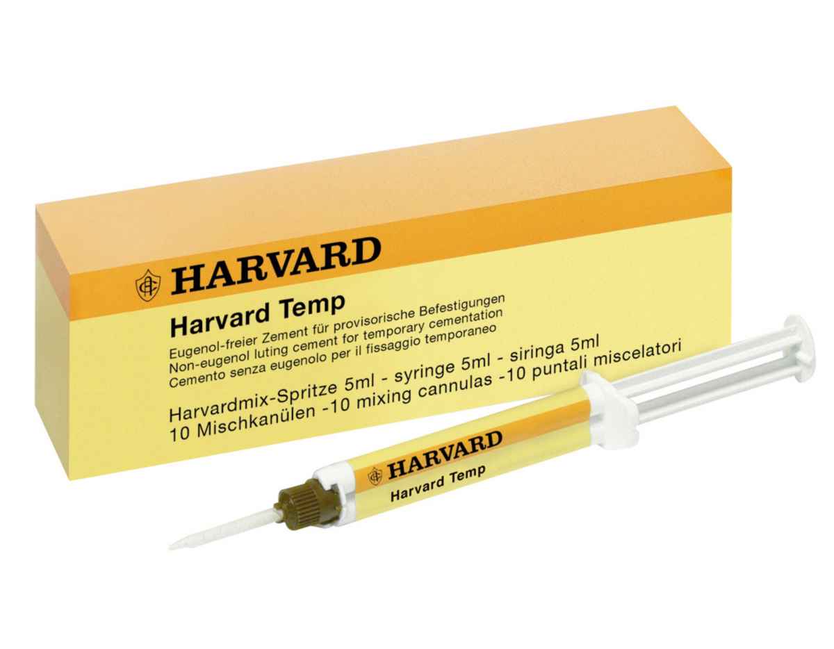 HARVARD TEMP Cemento all'ossido di zinco, senza eugenolo, per cementazioni provvisorie di ponti e corone, in siringa automiscelante. L'applicazione del materiale avviene direttamente tramite il puntale miscelatore, che può essere utilizzato da chiusura sino all'applicazione successiva. Confezione: 1 siringa Harvardmix da 5 ml + 10 puntali miscelatori