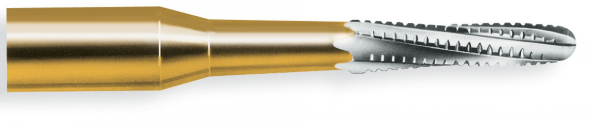 In tungsteno con forma elicoidale e taglio trasversale extrafine. Ideale per la perforazione di metalli con pressione assiale e per l'eliminazione dell'amalgama all'entrata dei canali, prima del trattamento.