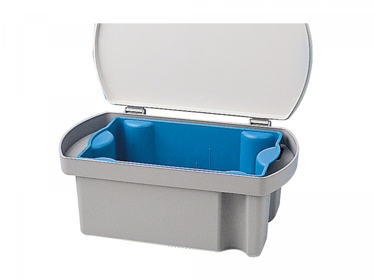 Box per la disinfezione e il trasporto degli strumenti,robusto e resistente con una capacita' fino a tre litri , contenitore setaccio integrato , dimensioni 13x32.5x21 cm.coperchio colore antracite con contenitore-setaccio blu o giallo .