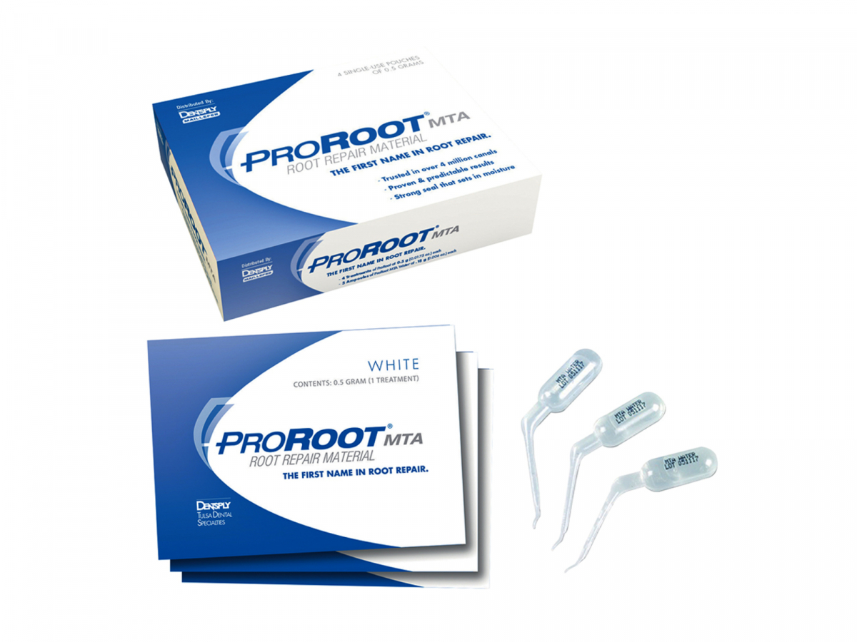 PROROOT MTA ProRoot MTA (Mineral Trioxide Aggregate) è un cemento per riparazioni canalari, indicato per opacificazioni, otturazioni retrograde, riparazioni di perforazioni canalari per incappucciamento della polpa. Chimicamente basato sull'acqua, permette il normale indurimento, anche in presenza di umidità. Confezione: 10 bustine da 0,5 gr cad. - MTA BIANCO
