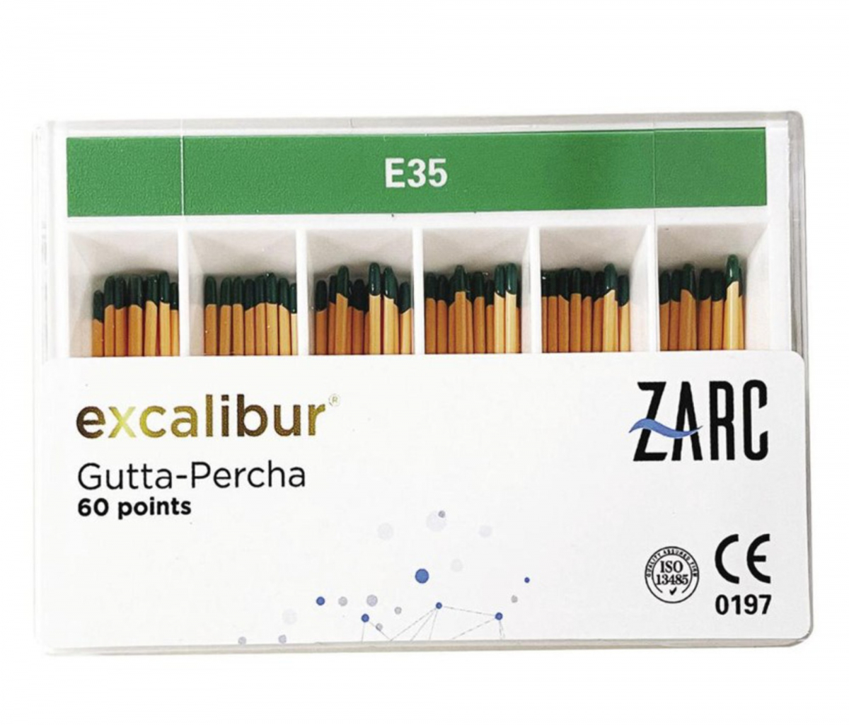 Punte di guttaperca create appositamente per la linea NiTi Excalibur Zarc. Si adattano perfettamente al canale sagomato con gli strumenti Excalibur e garantiscono una buona fluidità all'interno del canale radicolare. IN SLIDE BOX. Con terminale colorato. Confezione da 60 pz.