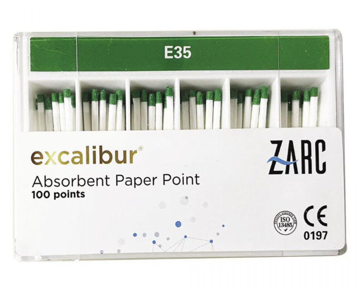 Punte di carta create appositamente per la linea NiTi Excalibur Zarc. Compatte ed estremamente assorbenti, si adattano perfettamente alla forma del canale sagomato con gli strumenti Excalibur e permettono di asciugare perfettamente prima dell'otturazione con coni di guttaperca, otturatori o cementi. IN SLIDE BOX. Con terminale colorato. Confezione da 100 pz.