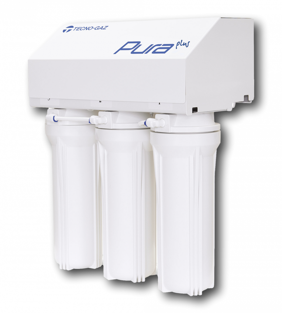 Il sistema ad osmosi mod. Pura Plus è un apparecchio per osmosi estremamente compatto, realizzato per essere connesso direttamente all’autoclave, garantendo una alimentazione continua di acqua pura. Il sistema può essere installato in svariate posizioni, facilitando così il montaggio e la collocazione negli spazi a disposizione. Il mod. Pura Plus è dotato di una serie di filtri e membrane osmotiche, la cui durata media è variabile fra i 600 e gli 800 Litri , in base alla durezza originaria dell’acqua.La cartuccia deve essere così sostituita una volta all’anno oppure ogni 600/700 cicli. Il cambio dei filtri è semplicissimo e può essere effettuato anche dagli operatori. Il costo complessivo dei filtri è contenutissimo e questo ci permette di avere un costo/litro esiguo.Il sistema Pura Plus, quando non produce acqua non è in pressione e questo evita qualsiasi tipo di problema in caso di rotture accidentali di raccordi o attacchi.