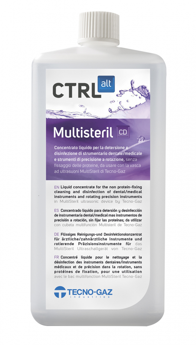 Liquido concentrato per la detersione e la disinfezione dello strumentario dentale/medicale e strumenti di precisione a rotazione, senza fissaggio delle proteine, da usare con la vasca ad ultrasuoni Multisteril Tecno Gaz.
