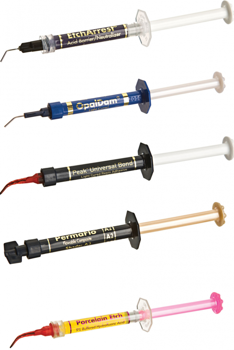 PORCELAIN REPAIR KIT Sistema che contiene tutti i prodotti necessari per la preparazione ed il fissaggio della ceramica, prima dell'applicazione del composito. La riparazione di un elemento in ceramica risulta più facile, veloce ed economica. Kit: 1 siringa da 1,2 ml EtchArrest + 1 siringa da 1,2 ml OpalDam + 1 siringa da 1,2 ml PermaFlo Dentin Opaquer + 1 siringa da 1,2 ml Peak Universal Bond + 1 siringa da 1,2 ml Porcelain Etch + 1 siringa da 1,2 ml Silano + 20 punte a pennello Black Mini + 20 punte Black Mini + 20 punte Micro 20 gr + 20 punte a pennello InSpiral