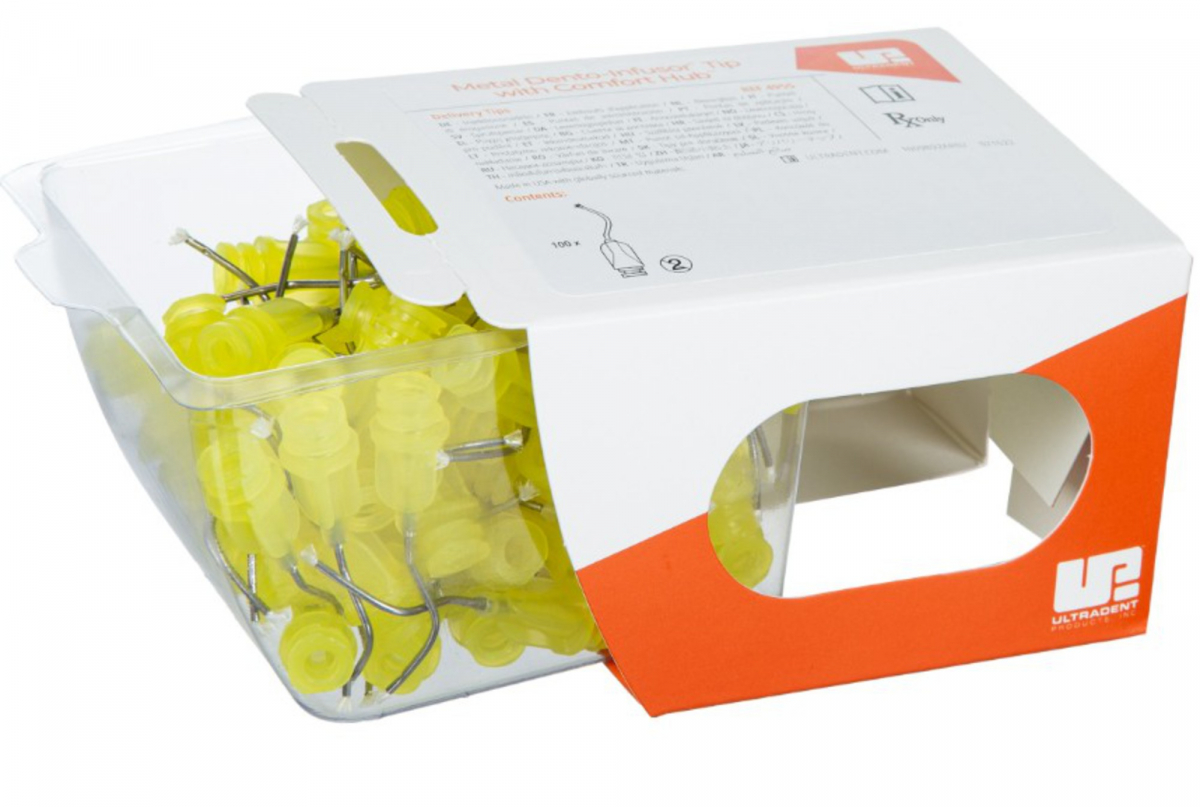 Il puntale Metal Dento-Infusor con Comfort Hub è un componente essenziale della famiglia di prodotti del Tissue Management di Ultradent. La sua estremità con spazzolino morbido consente di strofinare agevolmente l'emostatico sui capillari per una emostati profonda.