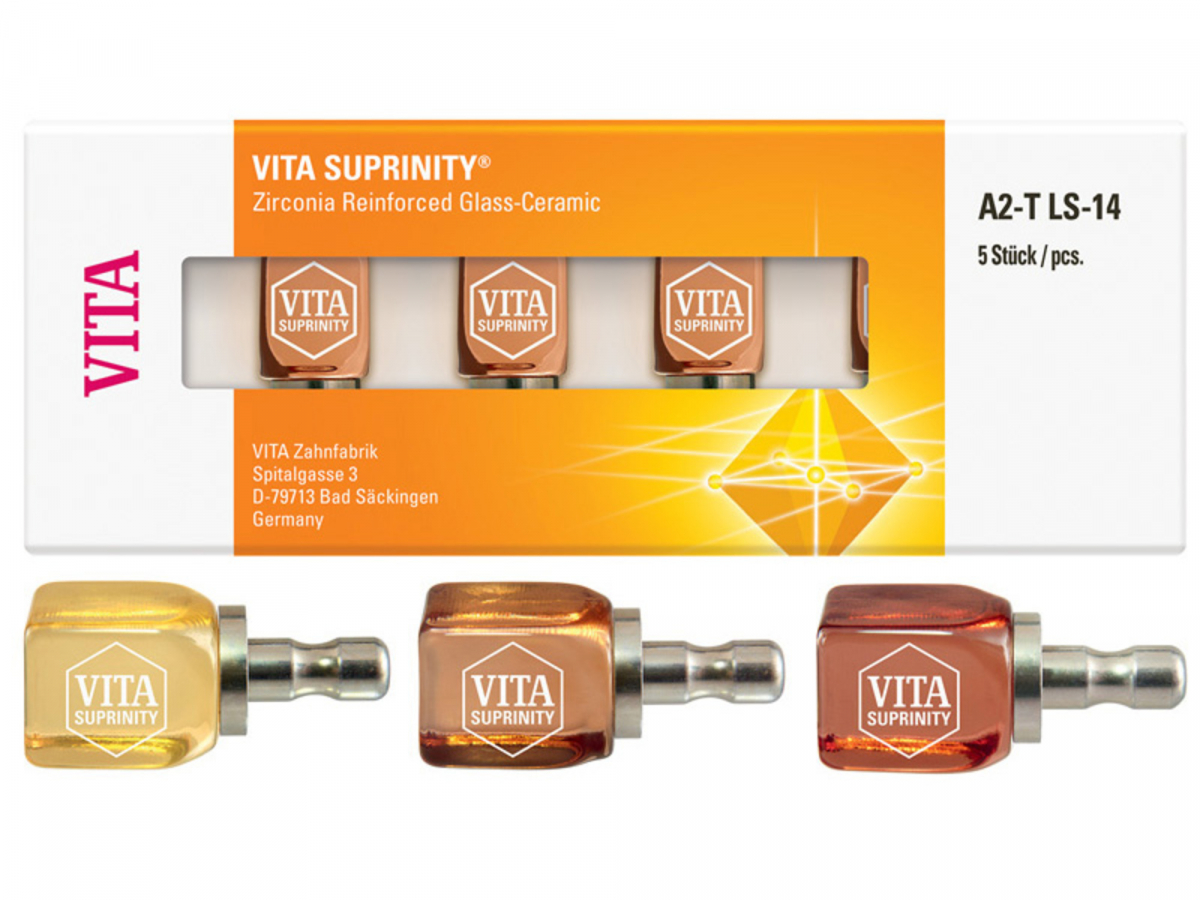 VITA SUPRINITY Blocchetti di vetroceramica precristallizzata, arricchita con biossido di zirconio (10% in peso), con eccellenti proprietà di lavorazione e di lucidabilità. Versatili per l'ampia gamma di indicazioni (corone posteriori, corone frontali, corone su impianti, faccette). Dopo la fresatura è necessaria una cottura di cristallizzazione o combinata. Disponibili nei livelli di traslucenza HT (High Translucent) e T (Translucent). Confezione da 5 blocchetti - Dimensioni: 18x14x12 mm (misura LS-14)