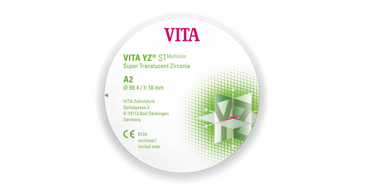 Disco pre-sinterizzato in biossido di Zirconio a super traslucenza (ST), pre-cromatizzato, parzialmente stabilizzato con Ittrio (Y-TZP) per sistematica CAD/CAM.