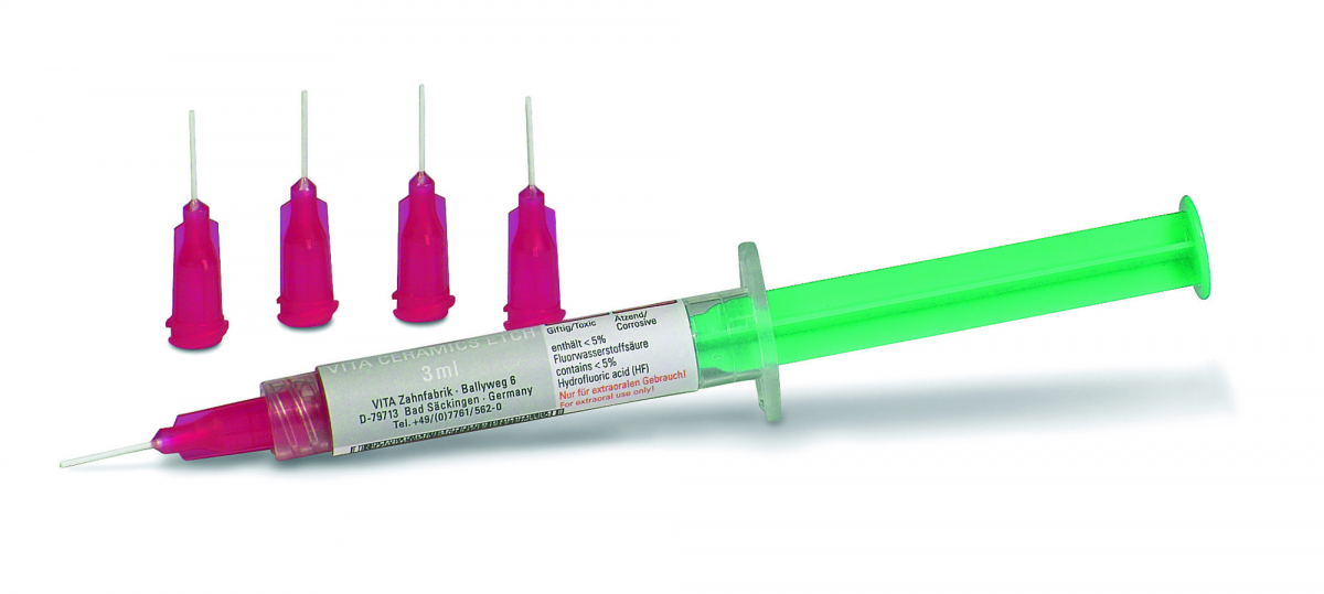 VITA CERAMICS ETCH è un gel a base di acido fluoridrico per la mordenzatura di restauri in ceramica. Serve per realizzare un profilo di ritenzione sui restauri in ceramica silicatica e ibrida, per aumentare l'adesione tra superficie ceramica a composito di fissaggio. 1ml VITA CERAMICS ETCH contiene 0,047 g di acido fluoridrico (HF). Destinato solo all'uso extra-orale.