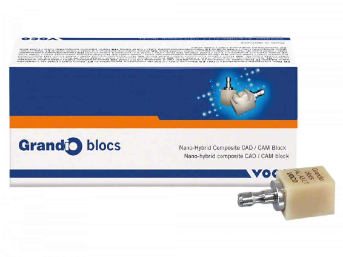 Blocchetti LT (Low Translucent) in composito nano-ibrido per il sistema CAD/CAM, hanno una resistenza superiore alla media e un contenuto di riempitivo più elevato (86%). I Grandio blocs hanno una somiglianza al dente perfetta, modulo di elasticità e durezza di superficie come il dente naturale, valori fisici eccellenti della resistenza alla flessione e dell’abrasione, nessun trattamente termico necessario, adatto per ogni dispositivo convenzionale sul mercato, ottima lucidatura e possibilità di riparazione, fresabile idealmente anche in caso di bordi sottili, basato sulla tecnologia nano-ibrida. Misura: 14(14,9x14,9 x18 mm).