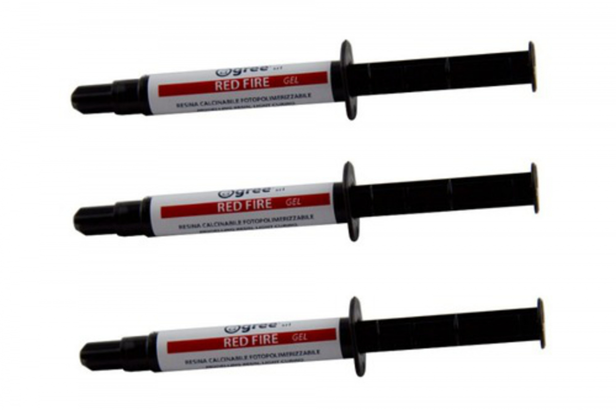 RED FIRE GEL e' una resina calcinabile fotopolimerizzabile di colore rosso in gel , il gel viene applicato direttamente dalla siringa dosatrice