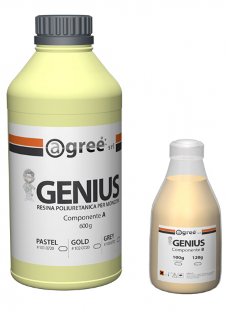 GENIUS Resina poliuretanica di ultima generazione per monconi, modelli master, modelli per implantologia, modelli studio e archivio. Ideale in tutte le lavorazioni che richiedono massima stabilità e fedele riproduzione dei dettagli: compatibile con tutti i materiali da impronta attualmente in commercio. Confezione: 1 flacone di componente A da 600 gr + 1 flacone di componente B da 1 20 gr + accessori. Colore Pastel.