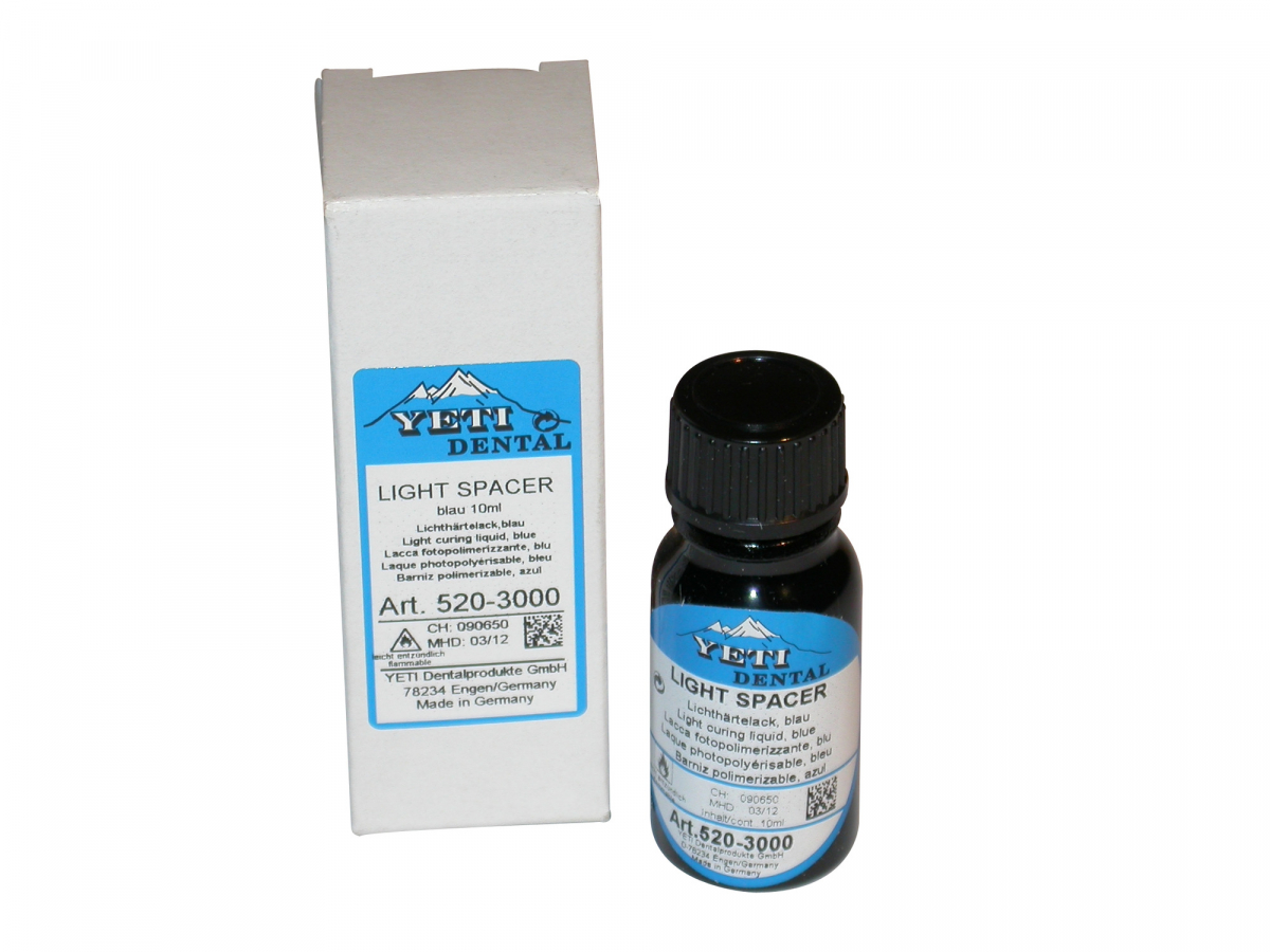 LIGHT SPACER Lacca spaziatrice fotopolimerizzabile: resistente alle graffiature e alla vaporizzazione, crea superfici molto dure, resistenti e lisce. Tempo di polimerizazione: 2-5 minuti. Flacone da 10 ml. Colore Blu (10 µm).
