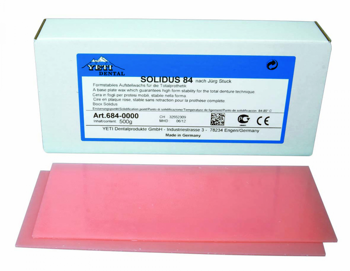CERA SOLIDUS Cera in fogli per protesi mobile, dai colori molto naturali ed elevato punto di solidificazione. Ideale per prove dirette di protesi totali senza che si verifichino spostamenti indesiderati di denti montati. Grande rigidità e bassissima retrazione. Spessore 1,5 mm. SOLIDUS 84 dura - punto di solidificazione 84°-85°C. Confezione da 500 gr. Colore Rosa Salmone
