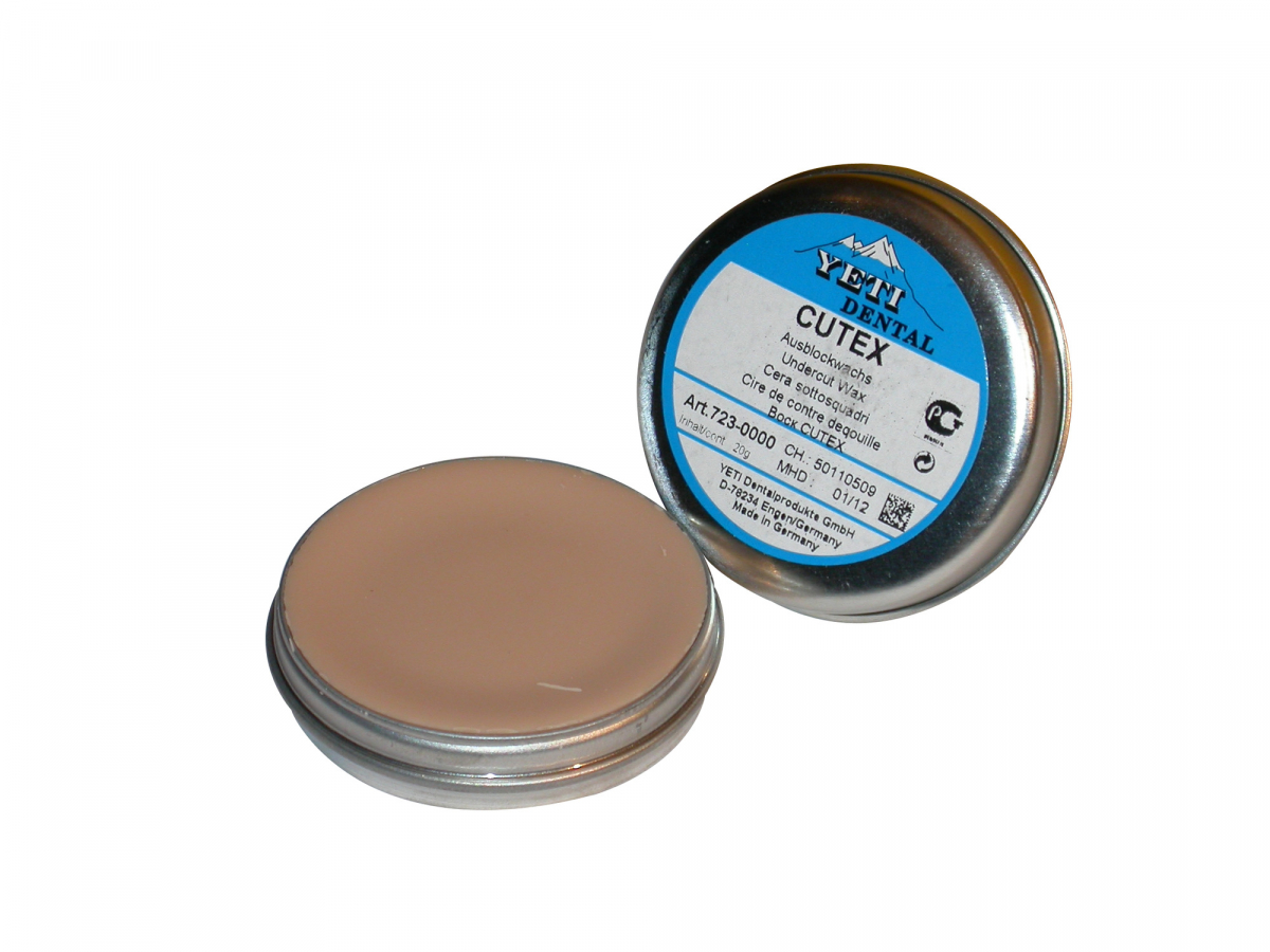 CERA CUTEX PER SOTTOSQUADRI Indicata per eliminare sottosquadri, ruvidità e imperfezioni del moncone in gesso. Estremamente dura, dopo averla applicata sul moncone consente di ottenere superfici lisce e levigate. Grazie al punto di fusione molto alto non si unisce alle altre cere, come ad esempio quelle per immersione, cere base o cere cervicali. Va applicata sempre dopo la preparazione del moncone con gli spaziatori. L'eccedenza può essere asportata molto facilmente dal moncone e la correzione risulta indistinguibile. Da non utilizzare per fusioni poichè quando brucia lascia residui. Scatola da 20 gr. COLORE BEIGE TRASPARENTE