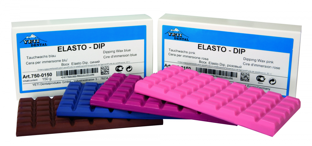 CERA ELASTO DIP Cera da immersione contenente resine naturali grazie alle quali, dopo il raffreddamento, rimane molto elastica e stabile nella forma. Si ottengono cappette di elevata resistenza alla rottura; è particolarmente adatta per la realizzazione di corone telescopiche e in parte nella tecnica conometrica. Facilmente dosabile grazie al formato in tavolette. Scatola da 150 gr. COLORE BLU