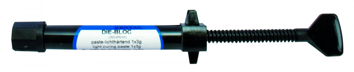 DIE BLOC Materiale fotopolimerizzabile per sottosquadri, utilizzabile con tutti gli spaziatori. Dosaggio preciso grazie alle due consistenze: liquida o pastosa. Siringa da 3 gr di pasta. Colore Blu.
