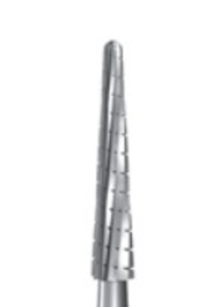 Fresone in carburo di tungsteno con punta conica arrotondata lunga e taglio FX incrociato fine per manipolo dritto.